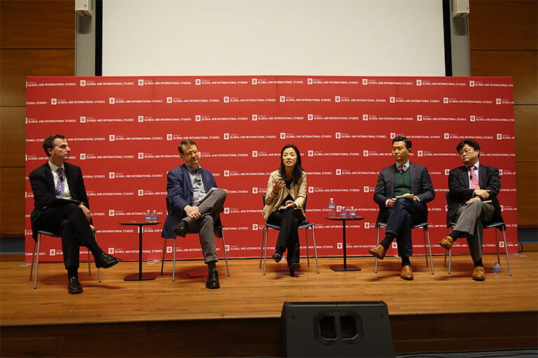 Finally, Lee Feinstein, dean of IU's Hamilton Lugar School of Global and International Studies and former U.S. ambassador to the Republic of Poland, moderated a policy discussion about the Korea-China relationship. The panelists were Jaewoo Choo, professor of Chinese foreign policy at Kyung Hee University in South Korea; Mark Minton, professor of practice in the Hamilton Lugar School, former president of the Korea Society in New York and former U.S. ambassador to Mongolia; Jung H. Pak, senior fellow and SK-Korea Foundation Chair in Korean studies at Brookings Institution’s Center for East Asia Policy Studies; and John Park, an Asia security analyst and director of Korea projects at the Harvard Kennedy School.